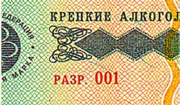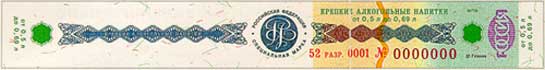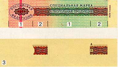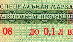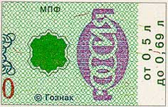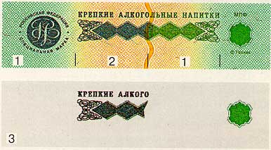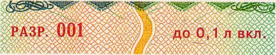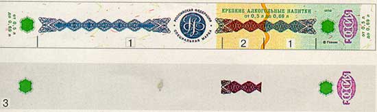 бумага белого цвета с многотоновым водяным знаком, представляющим собой слово АКЦИЗ. Бумага содержит защитные волокна двух видов: красные, не светящиеся в УФ-излучении, и зеленые, светящиеся в УФ- излучении зеленым цветом. |