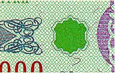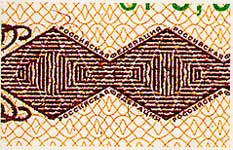 (латентное) изображение. При рассмотрении марок в косо падающем свете в орнаментальной полосе (на марках формата 160 х 20 мм в правой части) видно скрытое изображение ромбов. Причем в зависимости от угла зрения внутренние ромбы видны то как светлые на фоне |