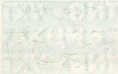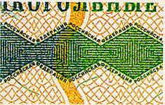 бумага палевого цвета с трех-тоновым водяным знаком, образованным сплетенными вытянутыми шестигранниками. Бумага имеет защитные волокна двух видов: красные, не светящиеся в УФ-излучении и светло-зеленые, светящиеся в УФ-излучении зеленым цветом. |
