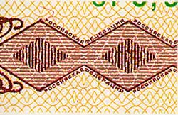 Микротекст отпечатан металлографской печатью вдоль верхней и нижней сторон орнаментальной полосы и состоит из повторяющихся слов РОССИЙСКАЯ ФЕДЕРАЦИЯ. |